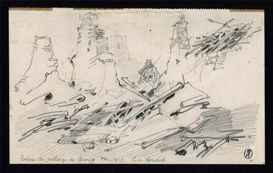 Charles Huard (1874-1965) Antique Pencil Drawing - Crouy France 1915 - WW1